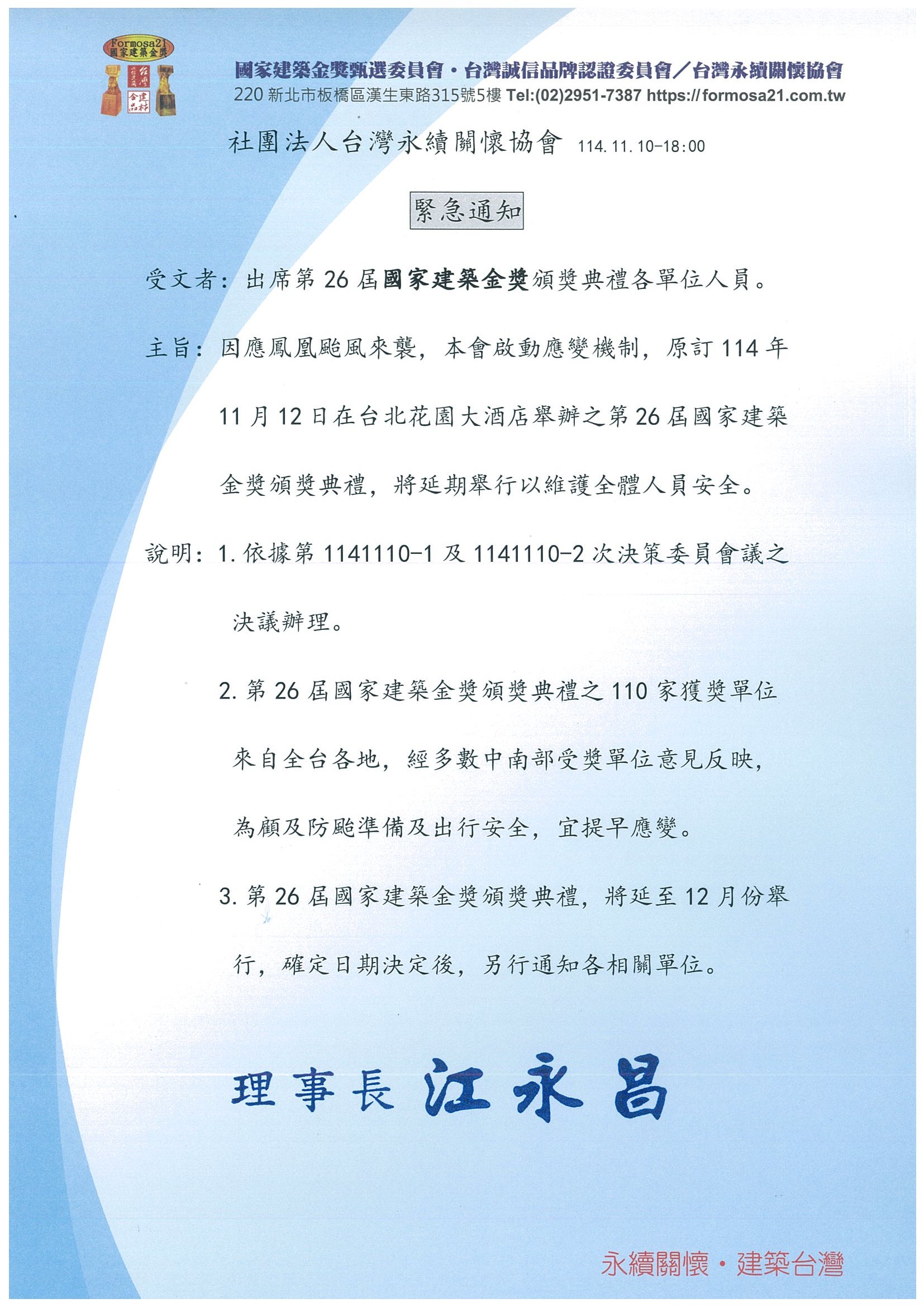因應鳳凰颱風來襲,本會啟動應變機制,原訂114年11月12日在台北花園大酒店舉辦之第26屆國家建築金獎頒獎典禮,將延期舉行以維護全體人員安全。
