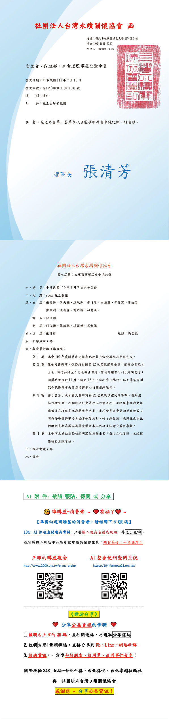 | 公告:台灣永續關懷協會-110.07.07第7屆第9次理監事聯席會會議記錄暨年度活動資訊以及公益宣導訊息